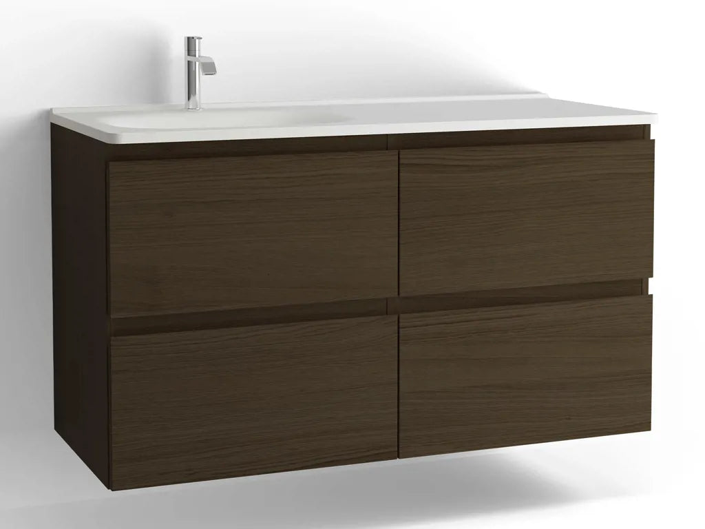 Vedum Flow 1200 brun ek med fyra lådor är ett stilfullt tvättställsskåp i modern design från Vedum. Det ingår i Flow-serien, känd för sina rena linjer och harmoniska proportioner. För att komplettera skåpet kan du lägga till en blandare och tvättställ. Skåpet är utrustat med en dämpad fullutdragslåda med fasade greppkanter.